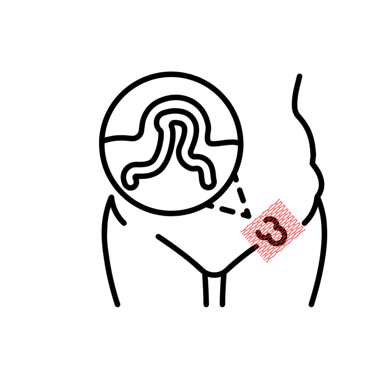• Diretta: protrusione del contenuto addominale attraverso un punto di debolezza della parete muscolare posteriore del canale inguinale, in particolare nel cosiddetto triangolo di Hesselbach. È una forma acquisita di ernia, che si sviluppa nel tempo a causa dell’indebolimento dei muscoli dell’inguine.