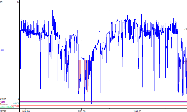 🔹 Un pH inferiore a 4 per più del 4-6% del tempo totale è suggestivo di reflusso patologico.